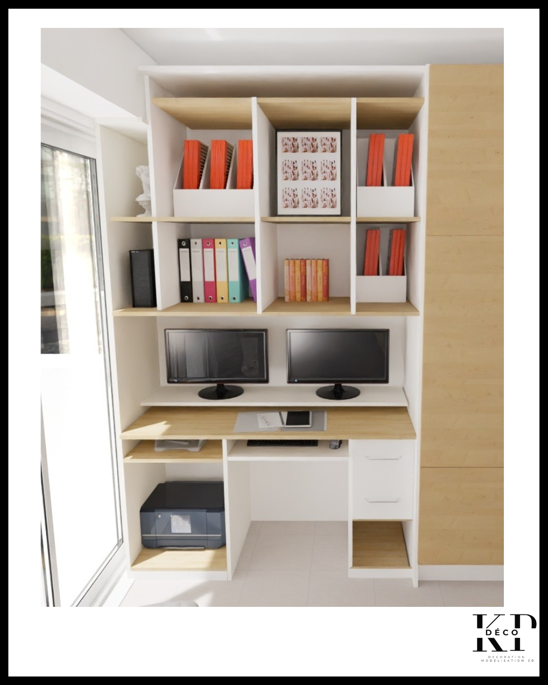 Pour ce projet à Nice, ma cliente avait des demandes très précises : intégrer deux écrans, des classeurs, un cadre photo personnel, plusieurs statues bibliques et un espace pour l’imprimante, tout en conservant un maximum de fonctionnalité. Le meuble a été entièrement conçu pour répondre à ces besoins, avec des tiroirs de rangement, des portes partielles pour dissimuler l’ensemble de façon élégante, et une harmonie parfaite avec le reste du salon, dans une ambiance bois clair et blanc. Un véritable bureau sur mesure, à la fois pratique, esthétique et parfaitement intégré à son intérieur.