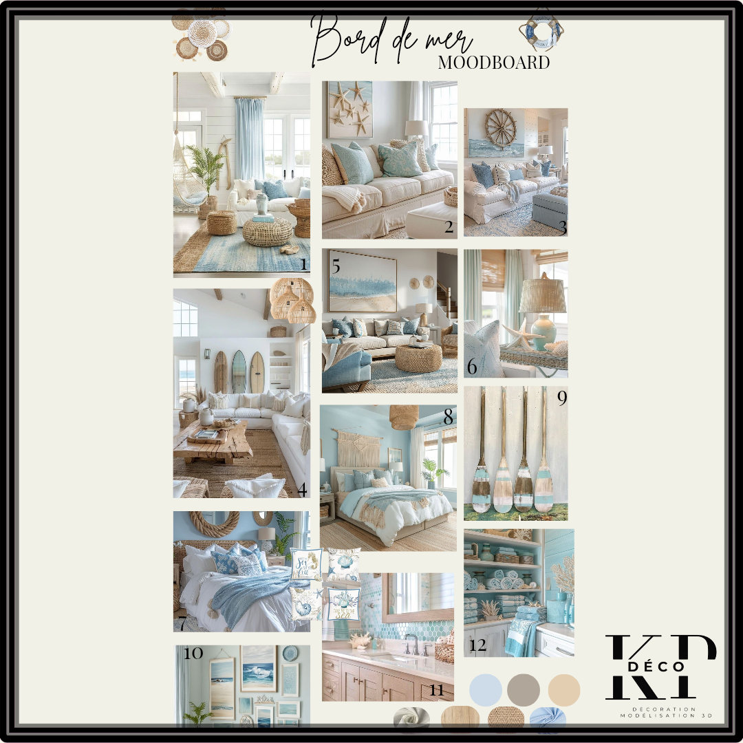 Je crée ensuite des planches d’ambiance et de mobilier, adaptées à vos besoins, pour vous permettre de visualiser l’agencement et l’atmosphère idéale pour votre intérieur.