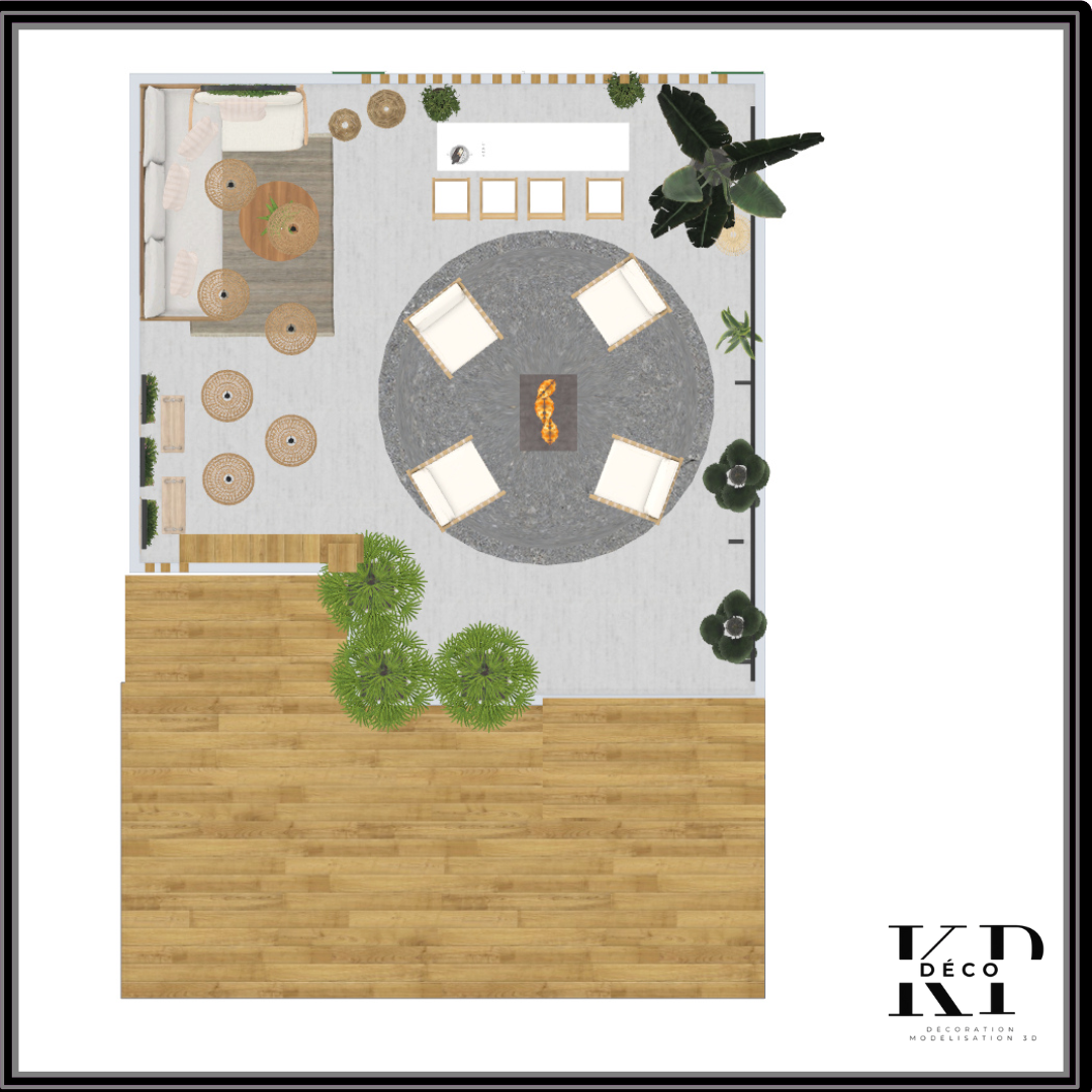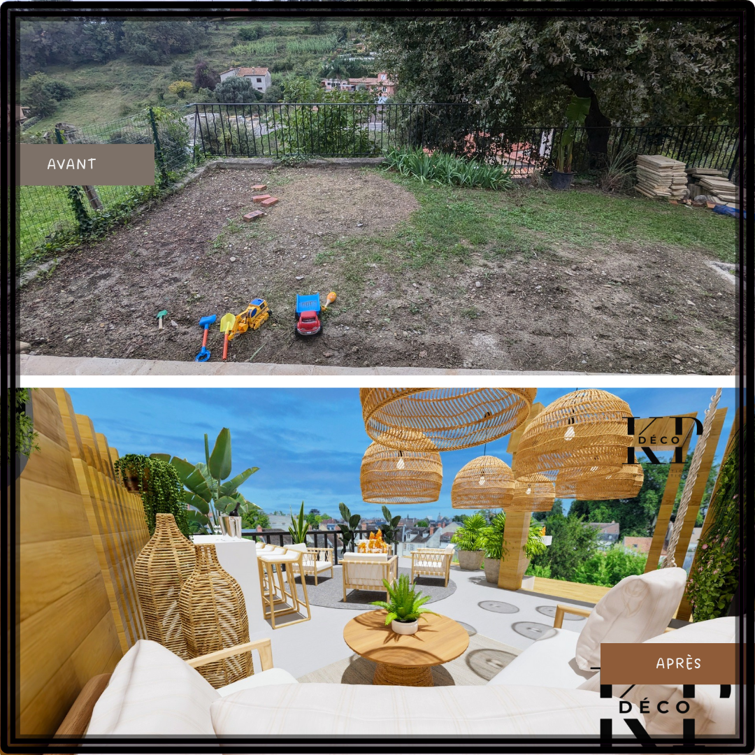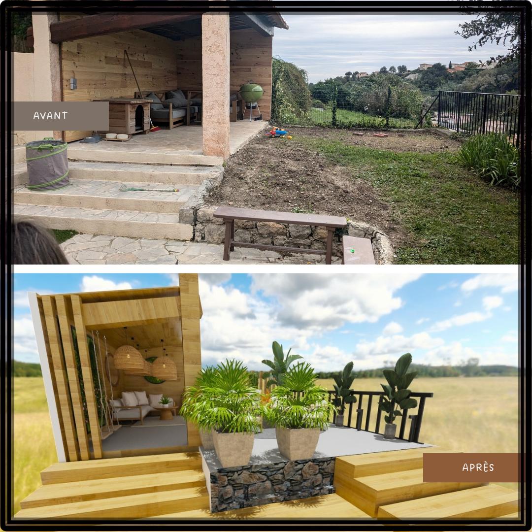 Pour cette terrasse en bord de Méditerranée, j’ai imaginé un espace à la fois apaisant, convivial et parfaitement adapté à la vie de famille. Bois, béton, blanc et végétation locale composent un décor naturel et lumineux, pensé pour durer et facile à vivre. Chaque élément a été conçu en fonction des habitudes et des envies de ce jeune couple avec enfants. Des assises confortables, des zones ombragées, et même des balançoires ont été intégrées pour le plus grand bonheur de leurs enfants, qui vont s’y régaler. Un extérieur sur mesure, où style et fonctionnalité se rencontrent avec simplicité.